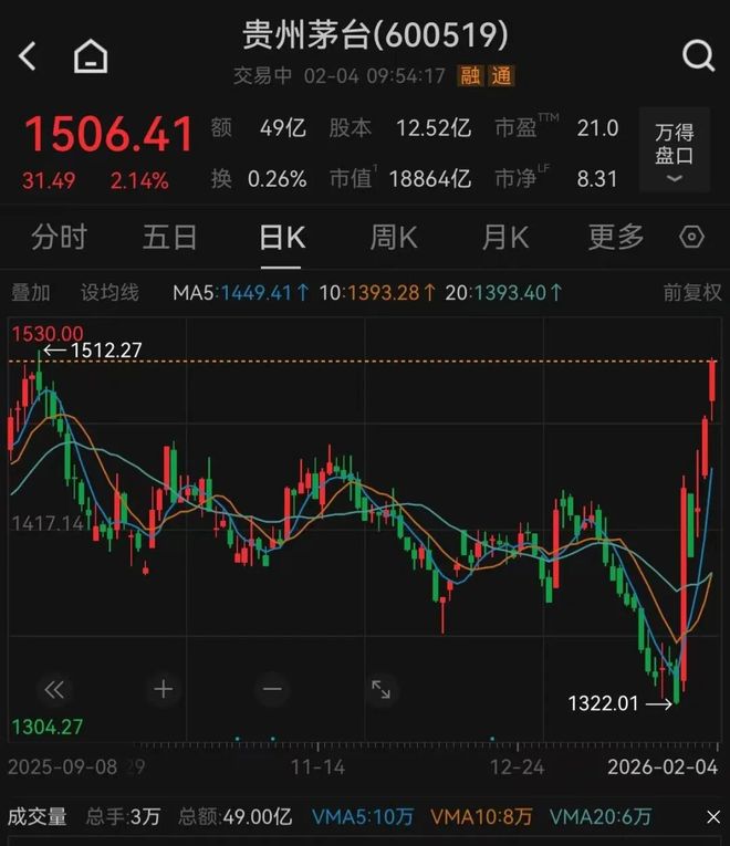 贵州茅台盘中涨近2%,股价重回1500元,为2025年9月15日以来首次。