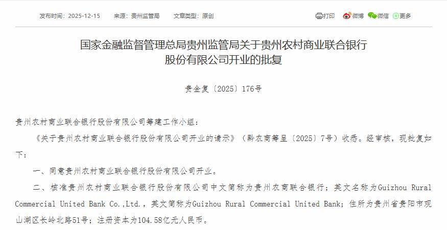 12月15日,国家金融监督管理总局贵州监管局发布批复,同意贵州农村商业联合银行股份有限公司(下称"贵州农商联合银 行")开业,注册资本为104.58亿元人民币。 批复核准贵州农商联合银行股东构成、出资额、持股份额和持股比例。其中,贵州省财政厅为第一大股东,出资15.72亿元 人民币,持股15.72亿股,持股比例15.032%;贵州金融控股集团有限责任公司(贵州贵民投资集团有限责任公司)为第二大 股东,出资68.86亿元人民币,持股68.86亿股,持股比例65.844%;中国贵州茅台酒厂(集团)有限责任公司为第三大股东, 出资10亿元人民币,持股10亿股,持股比例9.562%;贵州省黔晟国有资产经营有限责任公司为第四大股东,出资10亿元人民 币,持股10亿股,持股比例9.562%。 批复同时公布了贵州农商联合银行领导班子成员。其中,杨松获批出任该行董事、董事长;杨鸿钧获批出任该行董事、副董 事长、行长。此外,批复指出,贵州农商联合银行开业之日,原贵州省农村信用社联合社自行终止,其债权债务由贵州农村 商业联合银行股份有限公司承继。 ...