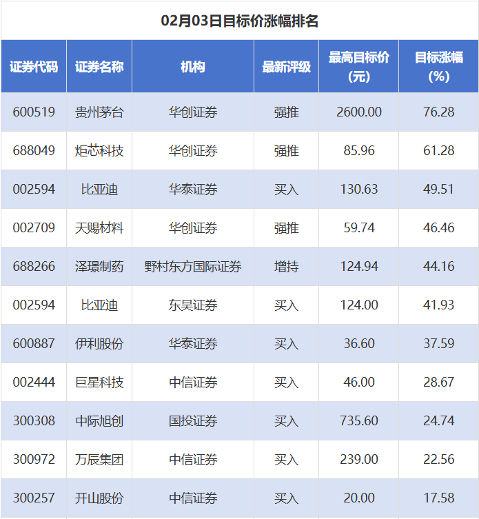 | | 02月03日券商推荐家数排名 | | | | | --- | --- | --- | --- | --- | | 证券代码 | 证券名称 | 收盘价(元) | 评级券商数量 | 行业 | | 002594 | 比亚迪 | 87.37 | 3 | 乖用车 | | | 日期: 02月03日,南财投研通×21快讯制图 | | | | 首次覆盖方面,2月3日券商共给出了7次首次覆盖,其中中国巨石(600176)获得国联民生(601456) 证券给予"推荐"评级,欧莱新材获得东北证券给予"增持"评级,环旭电子(601231)获得甬兴证券给 予"买入"评级,长白山(603099)获得华源证券给予"增持"评级,江西铜业(600362)获得开源证券给 予"买入"评级。 | | | 7家最新被首次覆盖的公司 | | | | --- | --- | --- | --- | --- | | 证券代码 | 证券名称 | 机构 | 最新评级 | 行业 | | 600176 | 中国巨石 | 国联民生证券 | 推荐 | 玻璃玻纤 | | 688530 | 欧莱新材 | 东北证券 | 增持 | 半导体 | | 601231 | 环 ...