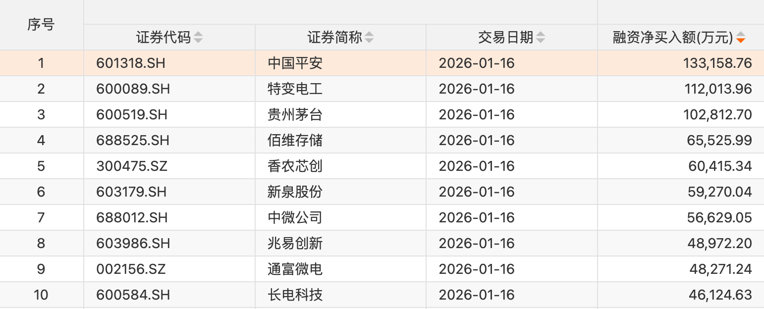 上证报中国证券网讯(刘禹希 记者 徐蔚)截至1月16日,A股两融余额为27315.37亿元,较上一交易日增加127.86亿元,占A股流通市值比例为1.65%。当日 两融交易额为3364.9亿元,较上一交易日增加184.47亿元,占A股成交额的10.99%。 | 序号 | | | | | --- | --- | --- | --- | | | 证券代码 ◆ | 证券简称 ◆ | 交易日期 ◆ | | 1 | 601318.SH | 中国平安 | 2026-01-16 | | 2 | 600089.SH | 特变电工 | 2026-01-16 | | 3 | 600519.SH | 贵州茅台 | 2026-01-16 | | ব | 688525.SH | 佰维存储 | 2026-01-16 | | 5 | 300475.SZ | 香农芯创 | 2026-01-16 | | 6 | 603179.SH | 新泉股份 | 2026-01-16 | | 7 | 688012.SH | 中微公司 | 2026-01-16 | | 8 | 603986.SH | 兆易创新 | 2026-01-16 | | ರಿ | 00 ...