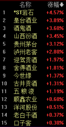 白酒(核心股)板块午后再度拉升,皇台酒业、酒鬼酒、山西汾酒、贵州茅台等涨超3%,其中贵州茅 台股价站稳1500元,泸州老窖涨超2%,迎驾贡酒、舍得酒业涨近2%。 | | 名称 | 涨幅量 | | --- | --- | --- | | | *ST岩石 | +4.57% | | 2 | 青岛湿补 | +3.89% | | 3 | 酒鬼酒 | +3.60% | | 4 | 山西汾酒 | +3.45% | | 5 | 贵州茅台 | +3.12% | | 6 | 泸州老窖 | +2.80% | | 7 | 迎驾贡酒 | +1.97% | | 8 | 毛得湿补 | +1.81% | | ਰੇ | 今世缘 | +1.37% | | 10 | 古井贡酒 | +1.31% | | 11 | 五粮液 | +1.19% | | 12 | 顺喜农业 | +0.60% | | 13 | 洋河股份 | +0.51% | | 14 | 老白干酒 | +0.37% | | 15 | ロ子窖 | +0.30% | 当前市场炒作的核心在于白酒(核心股)行业周期拐点将至的预期,叠加春节消费旺季来临,行业"五 底阶段"与资本市场"三低一高"形成共 ...