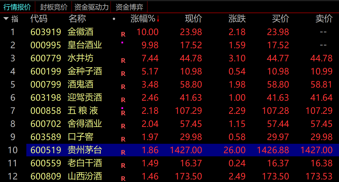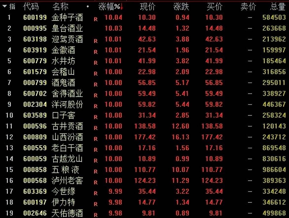 临近春节,白酒板块迎来了久违的大爆发,19只白酒股涨停,飞天茅台涨至1610元,板块"小阳春"行情要来了吗? | ▼指 代码 | 名称 | | 汽帽% | 现价 | 涨跌 | 买价 | 卖价 | | | --- | --- | --- | --- | --- | --- | --- | --- | --- | | 1 | 600199 金种子酒 | | R 10.04 | 10.30 | 0.94 | 10.30 | | 58 | | 2 | 000995 皇台酒业 | | 10.03 | 14.48 | 1.32 | 14.48 | | 26 | | 3 | 603198 迎驾贡酒 | R | 10.01 | 42.63 | 3.88 | 42.63 | | 21 | | 4 | 603919 全徽酒 | R | 10.01 | 21.54 | 1.96 | 21.54 | | 15 | | 5 | 600779 水井坊 | R | 10.01 | 41.99 | 3.82 | 41.99 | | 18 | | 6 | 601579 会稽山 | R | 10.00 | 22.98 | 2.09 | 22.9 ...