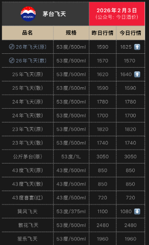 新华财经北京2月4日电(胡晨曦)2月4日,白酒股早盘逆势冲高,贵州茅台涨2%,股价重回1500元, 为2025年9月15日以来首次。此外,皇台酒业触及涨停,酒鬼酒、贵州茅台、泸州老窖、山西汾酒上 涨。 分析人士表示,白酒板块大涨主要受四方面推动:一是前期热门板块(如商业航天、芯片、算力、有 色)交易逻辑已充分演绎且估值偏高,市场存在"高低切换"需求,白酒成为新轮动方向;二是飞天茅台 批价回暖;三是当前市场聚焦"涨价"主线,从上游大宗商品向下游消费传导,白酒作为大消费代表受 益;四是春节等传统消费旺季临近,提振行业预期。 飞天茅台全线上涨 行业存货周转天数仍较长 在酒企积极自救的背景下,龙头企业的战略变革尤为引人注目。作为行业"风向标",贵州茅台开启的新 一轮市场化改革,为应对此轮周期性调整提供了关键样本。2026年初,贵州茅台发布《2026年贵州茅台 酒市场化运营方案》,其核心在于构建以消费者为导向的价格形成机制,打破出厂价刚性约束,推 动"多价态并存"的生态体系。 新华财经数据显示,截至2025年三季度末,白酒企业平均存货周转天数接近4年半。水井坊存货余额高 达37.98亿元,同比增长29.2%,创历史新高 ...