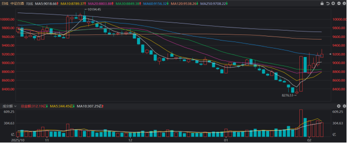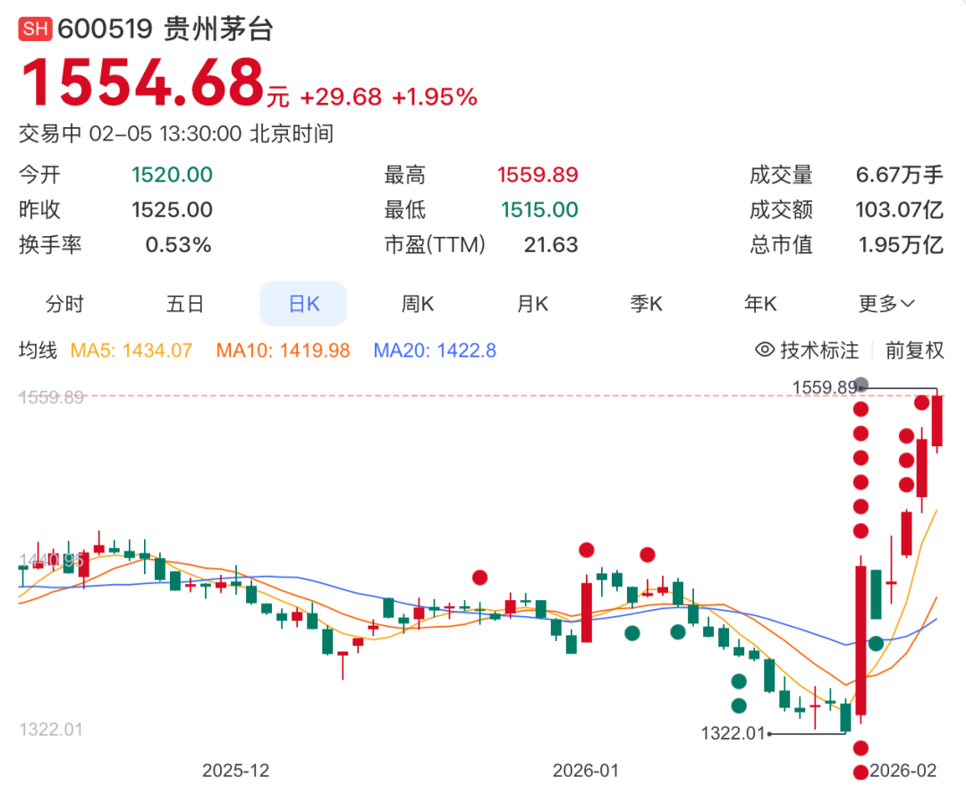 板块均价方面,白酒板块当前平均价格回升至127.07元,重返申万二级板块排行榜首位,此前均价短暂超越白酒板块的半导体板块均价回落至105.17元,暂 居第三位,医疗美容板块以109.45元位列第二位。 近期飞天茅台批价持续回暖,2月4日2026年飞天茅台原箱批发价报1665元/瓶,较前一日上涨40元,近半个月累计上涨125元。批价回升从侧面印证了贵州茅 台市场化转型的成效,2026年初"i茅台"平台上线普飞等产品,渠道库存压力缓解,市场对高端白酒需求韧性的预期得到修正。同时,地产政策边际优化、 市场资金高低轮动等因素,也为白酒板块反弹提供支撑。 市场有风险,投资需谨慎。本文为AI基于第三方数据生成,仅供参考,不构成个人投资建议。 来源:市场资讯 2月5日,白酒板块延续反弹行情,中证白酒指数实现4连涨。个股方面,皇台酒业涨近6%,贵州茅台、舍得酒业、古井贡酒涨超1%,其中贵州茅台盘中股 价创2025年5月以来近9个月新高。 作为板块权重龙头,贵州茅台股价自1月下旬经历9连跌后,自1月29日起开启快速反弹,截至2月5日累计回升17.5%,跑赢市场98.6%的个股同期表现。1月 29日,贵州茅台大涨8.6%,全天成 ...