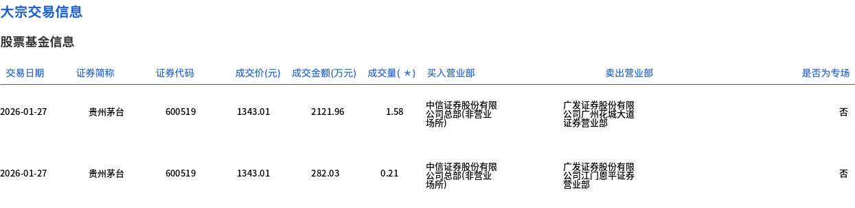 1月27日,贵州茅台大宗交易成交1.79万股,成交额2403.99万元,占当日总成交额的0.37%,成交价1343.01元,较市场收盘价1343.01元持平。 | 交易日期 | 证券简称 | 证券代码 | 成交价(元) | 成交金额(万元) 成交量( * ) 买入营业部 | | 卖出营业部 | | --- | --- | --- | --- | --- | --- | --- | | 2026-01-27 | 贵州茅台 | 200519 | 1343.01 | 2121.96 1.58 | 中信证券股份有限 公司总部(非营业 | 公司广州设计具 | | 2026-01-27 | 贵州茅台 | 600510 | 1343.01 | 282.03 0.21 | 中信证券股份有限 公司总部借鉴于 | 广发证券股份有限 | ...