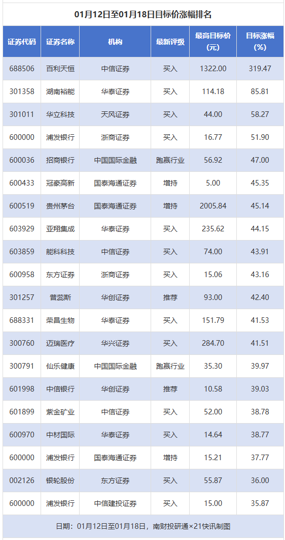 21财经1月19日电,南财投研通数据显示,1月12日至1月18日,券商给予上市公司目标价共92次,按最 新收盘价计算,目标价涨幅排名居前的公司有百利天恒、湖南裕能、华立科技,目标价涨幅分别为 319.47%、85.81%、58.27%,分别属于化学制药、电池、文娱用品行业。从券商推荐家数来看,1月12 日至1月18日有191家上市公司得到券商推荐,其中东鹏饮料获得9家推荐,浦发银行获得8家推荐,潮宏 基、长江电力、贵州茅台等获得7家推荐。查看原文:贵州茅台等191股获推荐,百利天恒目标价涨幅超 300%丨券商评级观察刚刚 ...