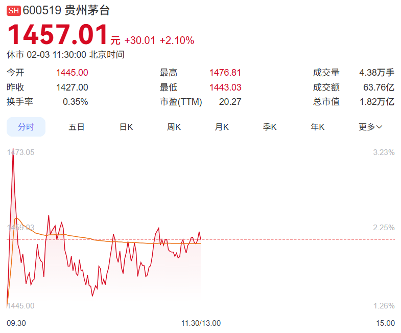 消息面上,茅台市场化改革初现成效,核心单品销量放量与价格韧性并现。i茅台发布1月月报,143万 笔飞天订单亮眼,C端渠道释放大众需求,叠加春节消费旺季窗口,飞天茅台动销表现超市场预期,也 为全年量价节奏调控奠定基础。 2月4日午后,贵州茅台(600519)股价继续上行,一度涨近4%,继2025年9月之后,首次重回1500元/ 股上方,盘中最高报1533元/股。 具体来看,目前飞天茅台批价围绕1500元/瓶附近震荡,该价位已逐步成为厂商、渠道与消费者之间的 共识区间。该机构维持茅台目标价1860元,对应26/27年25.8/25.4倍P/E,现价对应26/27年19.8/19.5倍 P/E,有30.34%上行空间。 白酒反弹之余,也可以关注大众食品的渐次修复机会,如食品ETF华夏(159151.SZ),不含白酒,聚焦乳 业/啤酒/调味品/软饮料等大众食品细分领域龙头(如伊利股份(600887)、海天味业(603288)、中粮 糖业(600737)、安琪酵母(600298)、双汇发展(000895)等),业绩风险基本释放,底层刚需韧性 强。 中金公司(601995)食品饮料分析师最新点评称:"飞天茅台价格筑底信号 ...