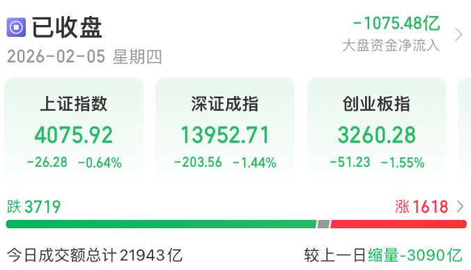 2月5日,A股延续回调态势,双创指数跌幅靠前,市场亏钱效应明显,3719只个股收绿,抛压集中于有色等资源股及通信等科技股,白酒、银行股相对抗 跌。 受访人士指出,今日缩量下跌体现节前避险情绪升温与存量资金高低切换,预计节前A股大概率震荡磨底。当前建议投资者保持中等仓位,保留现金灵活 性,可逢低分批布局白酒板块,不宜急于"抄底"科技、资源股,暂不建议盲目上车券商板块。 量能大幅萎缩 指数跌多涨少,沪指收跌0.64%报4075.92点,创业板指收跌1.55%报3260.28点,深证成指收跌1.44%。沪深300、上证50微跌,科创50跌逾1%,北证50跌 逾2%。 前两日交易量能微降,今日三市成交额缩减3090亿元,降至2.19万亿元。近期杠杆资金热度明显下降,截至2月4日,沪深京两融余额降至2.69万亿元。 市场亏钱效应明显,3719只个股收跌,跌停股23只;1618只个股收涨,涨停股56只。随着交易量缩减,今日成交额超百亿元个股仅9只,多数热门股收 跌,新易盛(300502)、紫金矿业(601899)跌幅均超4%,蓝色光标(300058)、天孚通信(300394)跌近6%。贵州茅台(600519)收涨1.97 ...