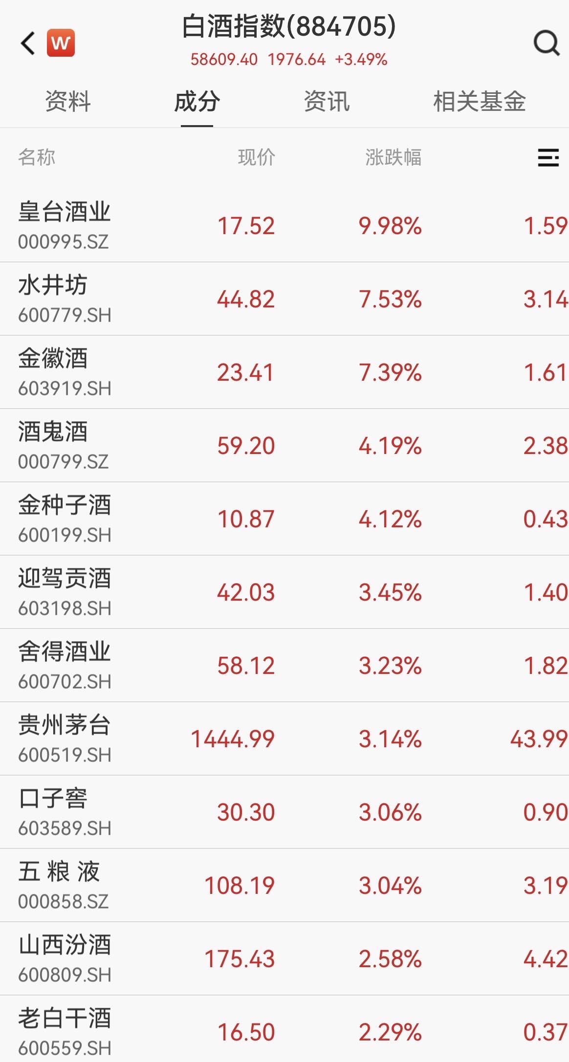 临近春节,白酒板块迎来了久违的大爆发,19只白酒股涨停,飞天茅台涨至1610元,板块"小阳春"行情要来了吗? | ▼指 代码 | 名称 | | 汽帽% | 现价 | 涨跌 | 买价 | 卖价 | | | --- | --- | --- | --- | --- | --- | --- | --- | --- | | 1 | 600199 金种子酒 | | R 10.04 | 10.30 | 0.94 | 10.30 | | 58 | | 2 | 000995 皇台酒业 | | 10.03 | 14.48 | 1.32 | 14.48 | | 26 | | 3 | 603198 迎驾贡酒 | R | 10.01 | 42.63 | 3.88 | 42.63 | | 21 | | 4 | 603919 全徽酒 | R | 10.01 | 21.54 | 1.96 | 21.54 | | 15 | | 5 | 600779 水井坊 | R | 10.01 | 41.99 | 3.82 | 41.99 | | 18 | | 6 | 601579 会稽山 | R | 10.00 | 22.98 | 2.09 | 22.9 ...