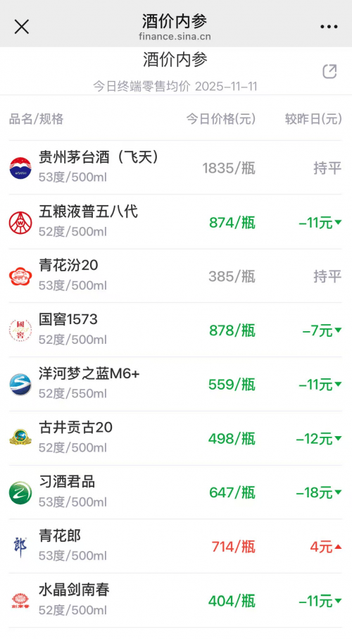 一年一度的"双11"电商大促进入最后的冲刺期。作为消费提振的关键节点,双11带动了年终消费旺季的 需求释放以及包括白酒在内的多个行业回暖。其中,飞天茅台凭借其稳健的市场表现有效提振了白酒消 费圈的整体热度,再次印证了其作为白酒价值典范的地位, 茅台终端价格体现消费者真实需求 据新浪财经推出的白酒终端价格服务体系"酒价内参"显示,11月11日飞天茅台终端成交均价为1835元/ 瓶,连日来保持平稳。据"酒价内参",其锁定"终端成交价"这一核心指标,既包括主流电商平台的公开 售价,也涵盖线下零售店、商超的实际交易价格,相较于经销商间的"调货价",更能体现市场最广泛的 真实需求。 | × | | 酒价内参 | | | --- | --- | --- | --- | | | | finance.sina.cn | | | | | 酒价内参 | (zi | | | | 今日终端零售均价 2025-11-11 | | | | 品名/规格 | 今日价格(元) | 较昨日(元) | | | 贵州茅台酒(飞天) 53度/500ml | 1835/瓶 | 持平 | | | 五粮液普五八代 52度/500ml | 874/瓶 | - ...
