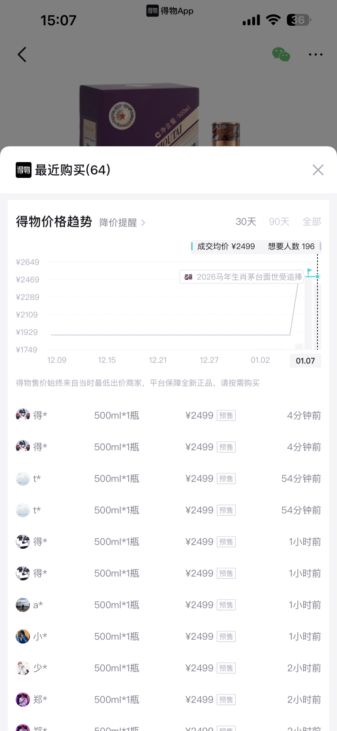 1月6日上午9时,贵州茅台酒(丙午马年)(以下简称"马茅"或"马年生肖茅台酒")生肖系列产品正式开售,此次首度引入寄售模式,也标志着茅台生肖 酒正式迈入第二个十二年周期。 茅台App显示,上线即告"秒空",而可快递配送的自选生产日期产品因"当前访问人数过多"无法购买。 与此同时,二级市场上已出现显著溢价。截至1月7日发稿前,根据得物App数据,马年生肖茅台经典款成交价由1899元上涨至2499元,溢价32%;珍享版 成交价则由2499元飙升至6899元,溢价4400元,高达176%。 15:08 500ml*1瓶 1小时前 ¥2499 | 预售 2小时前 500ml*1瓶 ¥2499 | 预售 ¥2499 | 预售 500ml*1瓶 2小时前 14146 il 得物App | 글 米 | 500ml*1瓶 | ¥2499 预售 | 1小时前 | | --- | --- | --- | --- | | 水 | 500ml*1瓶 | ¥2499 预售 | 1小时前 | | | | | ) t* | 500ml*1瓶 | ¥2499 预售 | 54分钟前 | | --- | --- | --- | --- | | ...