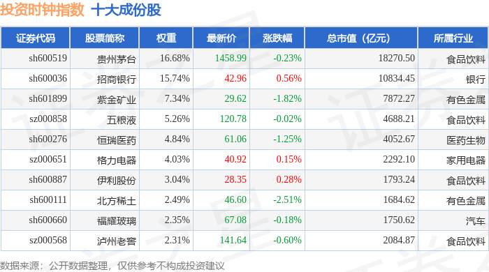 证券之星消息,11月11日,投资时钟(399391)指数报收于3417.83点,跌0.3%,成交932.51亿元,换手 率0.93%。当日该指数成份股中,上涨的有35家,华侨城A以10.15%的涨幅领涨,下跌的有61家,大连圣 亚以6.62%的跌幅领跌。 投资时钟(399391)指数十大成份股详情如下: | 投资时钟指数 十大成份股 | | --- | | 代码 | 名称 | 主力净流入(元) | 主力净占比 游资净流入 (元) | | 游资净占比 散户净流入 (元) | | 散户净占比 | | --- | --- | --- | --- | --- | --- | --- | --- | | 600489 | 中金黄金 | 2.09亿 | 11.80% | 641.65万 | 0.36% | -2.16 Z | -12.16% | | 600036 招商银行 | | 1.79亿 | 7.68% | -1.19 Z | -5.10% | -6013.55万 | -2.57% | | 000069 | 华侨城A | 1.44亿 | 14.85% | -8497.06万 | -8.73% | -5947.58万 ...