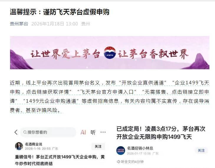 据"贵州茅台"公众号消息,1月18日,贵州茅台发文提示:近期,线上平台再次出现冒用茅台名义,发 布"开放企业直供通道""企业1499飞天申购,点击链接获取详情""飞天茅台官方申请入口""无需搭售、 点击链接立即申请""1499元企业申购通道"等虚假招商信息,有关内容均属不实宣传,存在误导消费 者、甚至诈骗风险。 贵州茅台表示,公司从未授权或委托任何主体,发布以上信息。目前,公司各省区自营店正在与原有企 业团购客户签订2026年销售合同,通过线下对接,进行资质审核、合同签约,未通过公开链接或社交媒 体直接受理申请。 同时,贵州茅台称,公司正积极配合有关部门对相关虚假招商行为调查处理,依法追究有关责任主体法 律责任,切实维护市场秩序和消费者权益。 ...
