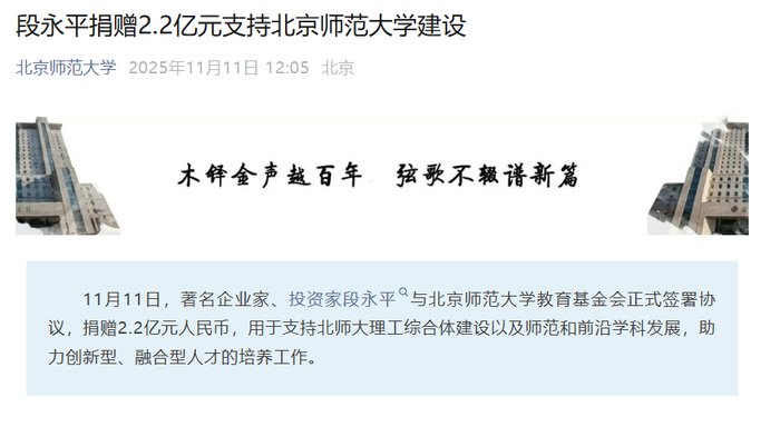 据北京师范大学微信公众号,11月11日,段永平与北京师范大学教育基金会正式签署协议,捐赠2.2亿 元人民币,用于支持北师大理工综合体建设以及师范和前沿学科发展,助力创新型、融合型人才的培养 工作。 上市公司或其投资者向高校以及相关教育机构捐款已屡见不鲜。 11月9日晚,天准科技(688003)公告,公司控股股东青一投资已于11月8日与苏州市教育发展基金会、 苏州市李政道教育和科学基金会分别签署《捐赠协议》,青一投资向前者无偿捐赠160万股无限售条件 流通股(占公司目前总股本的0.82%)及160万元,向后者无偿捐赠640万股无限售条件流通股(占公司 目前总股本的3.29%)及640万元。 作者:综合北京师范大学微信公号、本报此前报道 据悉,为感谢段永平及其母亲彭建华对学校发展的重要贡献,北京师范大学将珠海校区核心教学枢纽理 工综合体学术云环冠名为"段永平学术云环",并将理工综合体图书馆冠名为"彭建华图书馆"。 10月31日,段永平向江西省江西水利电力大学教育发展基金会无偿捐赠其持有的贵州茅台酒股份有限公 司股票壹万股(市值人民币1500万元)。 在捐款后,段永平还表达了对贵州茅台的信心,他表示:"他们每年花分 ...