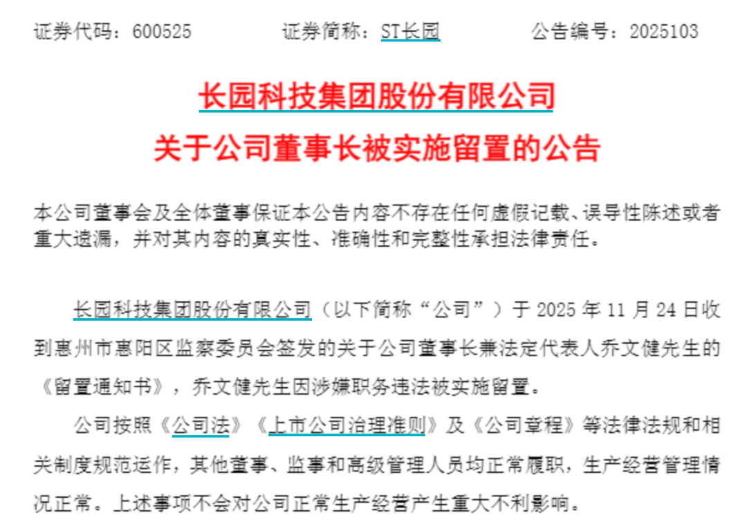 11月24日,ST长园(600525.SH,长园科技集团股份有限公司)披露关于公司董事长被实施留置的公 告。 公告称,公司于11月24日收到惠州市惠阳区监察委员会签发的关于公司董事长兼法定代表人乔文健的 《留置通知书》,乔文健因涉嫌职务违法被实施留置。 公司按照《公司法》、《上市公司治理准则》及《公司章程》等法律法规和相关制度规范运作,其他董 事、 监事和高级管理人员均正常履职,生产经营管理情况正常。上述事项不会对公司正常生产经营产 生重大不利影响。 资料显示,乔文健自2022年6月起任公司副总裁,并在今年4月和9月两次接棒原董事长吴启权,先后担 任总裁和董事长一职。 ST长园强调,截至本公告披露日,公司未收到有权机关对公司的任何调查或者配合调查文件,暂未知 悉留置调查的进展及结论。公司将持续关注后续进展,对相关工作进行妥善安排,并按照有关法律、法 规的规定和要求,及时履行信息披露义务。 此前的11月13日,ST长园公告称,公司收到广东省深圳市中级人民法院送达的诉讼材料,公司大股东 格力金投及其一致行动人金诺信以证券虚假陈述责任纠纷为由对公司提起民事诉讼,涉案金额合计约为 4.13亿元。 具体来看,ST长园在 ...