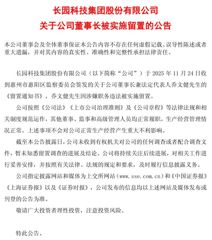 【#ST长园董事长乔文健被留置#】11月24日,ST长园(长园科技集团股份有限公司)披露关于公司董 事长被实施留置的公告。公告称,公司于11月24日收到惠州市惠阳区监察委员会签发的关于公司董事长 兼法定代表人乔文健的《留置通知书》,乔文健因涉嫌职务违法被实施留置。 公司按照《公司法》、《上市公司治理准则》及《公司章程》等法律法规和相关制度规范运作,其他董 事、 监事和高级管理人员均正常履职,生产经营管理情况正常。上述事项不会对公司正常生产经营产 生重大不利影响。(澎湃) ...