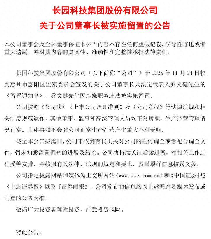 炒股就看金麒麟分析师研报,权威,专业,及时,全面,助您挖掘潜力主题机会! 这家上市公司董事长,上任两个月即被留置!什么情况? 每经编辑|杜宇 一则深夜公告,让本已深陷治理僵局的长园科技集团股份有限公司(以下简称ST长园(维权),600525.SH)再添新风波:公司董事长兼法定代表人乔文健 因涉嫌职务违法被实施留置。 11月25日,ST长园发布公告称,公司于11月24日收到惠州市惠阳区监察委员会签发的关于公司董事长兼法定代表人乔文健的《留置通知书》,其因涉嫌职 务违法被实施留置。 公告还称,截至目前,公司未收到有权机关对公司的任何调查或者配合调查文件,暂未知悉留置调查的进展及结论。 公告中明确,公司其他董事、监事和高级管理人员均正常履职,生产经营管理情况正常。 值得注意的是,此时离乔文健当选为董事长仅2个月。 图片来源:公司公告 今年9月12日,公司收到时任董事长吴启权提交的书面辞职报告,吴启权因个人原因申请辞去公司董事长、董事职务及董事会战略委员会委员职务。离任 后,吴启权不在公司及公司下属子公司担任任何职务。 9月27日,公司第九届董事会第十一次会议选举乔文健为公司董事长。表决结果显示:7票同意,2票反对, ...