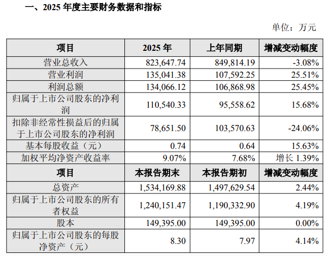 2月6日晚间,2025年正式成为华润三九旗下一员的天士力发布年度业绩快报。 初步核算,2025年公司营业总收入为82.36亿元,同比减少3.08%;归母净利润为11.05亿元,同比增加15.68%;扣非后归母净利润7.87亿元,同比下降 24.06%。 | 项目 | 2025 年 | 上年同期 | 增减变动幅度 | | --- | --- | --- | --- | | 营业总收入 | 823,647.74 | 849,814.19 | -3.08% | | 营业利润 | 135.041.38 | 107.592.25 | 25.51% | | 利润总额 | 134,066.12 | 106,868.98 | 25.45% | | 归属于上市公司股东的净利 润 | 110.540.33 | 95,558.62 | 15.68% | | 扣除非经常性损益后的归属 于上市公司股东的净利润 | 78.651.50 | 103,570.63 | -24.06% | | 基本每股收益(元) | 0.74 | 0.64 | 15.63% | | 加权平均净资产收益率 | 9.07% | 7.68% | 增长 1.39% ...