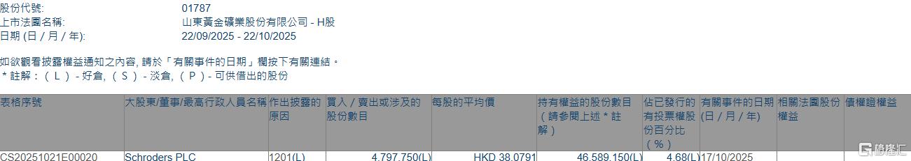 | 表格序號 | 大股東/董事/最高行政人員名稱作出披露的 買入 / 賣出或涉及的 每股的平均價 | | | | 持有權益的股份數目 佔已發行的 有關事件的日期 | | | --- | --- | --- | --- | --- | --- | --- | | | | 股份數目 | | | (請參閱上述 * 註 | 有投票權股 (日 / 月 / 年) | | | | | | | | 份自分比 | | | | | | | | 06 | | CS20251021E00020 | Schroders PLC 1201(L) | | 4.797.750(L) | HKD 38.0791 | 46.589.150(L) | 4.68(L) 17/10/2025 | 减持后,Schroders PLC最新持股数目为4658.915万股,持股比例由5.16%下降至4.68%。 | 股份代號: | 01787 | | --- | --- | | 上市法國名稱: | 山東黃金礦業股份有限公司 - H股 | | 日期 (日 / 月 / 年): | 22/09/2025 - 22/10/2025 | 格隆汇10月22日丨根据联交所 ...