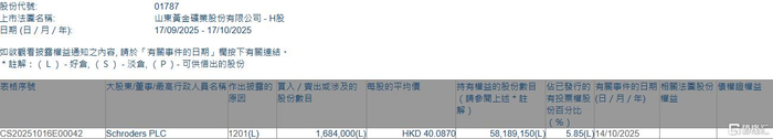 格隆汇10月17日丨根据联交所最新权益披露资料显示,2025年10月14日,山东黄金(01787.HK)遭 Schroders PLC在场内以每股均价40.087港元减持168.4万股,涉资约6750.65万港元。 减持后,Schroders PLC最新持股数目为5818.915万股,持股比例由6.01%下降至5.85%。 | 炭精度鼓 | 大股票/董事/股爲行政人員名稱 作出披露的 買入 / 費出或涉及的 每股的平均價 | | | | 持有權益的股份數目 佔已發行的 海關學生的目期 相關法員股份 價權證權益 | | --- | --- | --- | --- | --- | --- | | | 原因 | 股份數目 | | | ( 騎参閱上述 * 註 | | | | | | | 解) 份百分比 | | | | | | | ( % ) C MILY | | CS20251016E00042 Schroders PLC | 1201(L) | | 1.684 000(L) | HKD 40.0870 | 58 189 150(L) 5 85(L)14/10/2025 - ( P ) 2017 | | 股份代號: ...