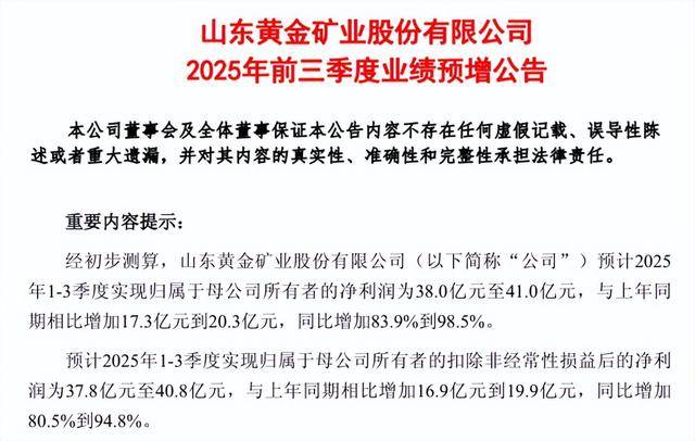 本公司董事会及全体董事保证本公告内容不存在任何虚假记载、误导性陈述或者重大遗漏,并对其内容 的真实性、准确性和完整性承担法律责任。 重要内容提示: 经初步测算,山东黄金矿业股份有限公司(以下简称"公司")预计2025年1-3季度实现归属于母公司所 有者的净利润为38.0亿元至41.0亿元,与上年同期相比增加17.3亿元到20.3亿元,同比增加83.9%到 98.5%。 预计2025年1-3季度实现归属于母公司所有者的扣除非经常性损益后的净利润为37.8亿元至40.8亿元,与 上年同期相比增加16.9亿元到19.9亿元,同比增加80.5%到94.8%。 1.经初步测算,公司预计2025年1-3季度实现归属于母公司所有者的净利润为38.0亿元至41.0亿元,与上 年同期相比增加17.3亿元到20.3亿元,同比增加83.9%到98.5%。 2.公司预计2025年1-3季度实现归属于母公司所有者的扣除非经常性损益后的净利润为37.8亿元至40.8亿 元,与上年同期相比增加16.9亿元到19.9亿元,同比增加80.5%到94.8%。 (三)本次所预计的业绩未经注册会计师审计 二、上年同期业绩情况 (一)归属于母公司所有 ...