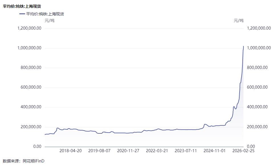据同花顺ifind数据,截至2月25日,上海现货的钨铁价格已经突破至102.25万元/吨。与去年同期(21.68万元/吨)相比涨了3.7倍! 中钨在线数据显示,2026年开年至今,黑钨精矿价格已达70.5万元/吨,较年初上涨53.26%;仲钨酸铵(APT)报105万元/吨,较年初上涨 56.72%,价格均创下历史新高。 可能很多人都没想到,2025-2026年大宗商品市场中,表现最突出的并非黄金、锂矿,而是被誉为"工业牙齿"的战略金属——钨。 2025年全年,钨价涨幅已超过220%,比同期黄金表现更为疯狂。 更可的是,这个涨势在今年继续飙涨。 这也难怪A股钨金属股成为年内表现最强品种之一。年内,翔鹭钨业涨幅159.34%,章源钨业涨幅达136%,中钨高新涨超112%。 从全球钨市场的供给格局来看,中国无疑占据着核心地位,而海外产能的缓慢释放,难以填补国内供给收缩留下的缺口。 2024年,中国的钨储量占全球52%,产量占83%,是全球最主要的钨供应国。 不过, 2025年起,国内进一步收紧钨资源管控,环保、安全督查严格限制表外矿山产出,供给总量明显收缩;2025年国内钨精矿(三氧化 钨含量65%)第一批开采总量 ...