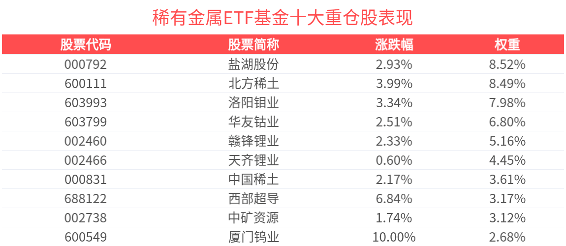 截至2025年10月27日午间收盘,中证稀有金属主题指数(930632)强势上涨2.83%,成分股厦门钨业(600549)10cm涨停,东方钽业(000962)上涨8.00%,中钨高 新(000657)上涨7.60%,西部超导(688122),三川智慧(300066)等个股跟涨。稀有金属ETF基金(561800)上涨2.70%, 冲击3连涨。 数据显示,截至2025年9月30日,中证稀有金属主题指数(930632)前十大权重股分别为北方稀土(600111)、洛阳钼业(603993)、华友钴业(603799)、盐湖股份 (000792)、赣锋锂业(002460)、天齐锂业(002466)、中国稀土(000831)、中矿资源(002738)、盛和资源(600392)、西部超导(688122),前十大权重股合计占比 59.91%。 | 股票代码 | 股票简称 | 涨跌幅 | 权重 | | --- | --- | --- | --- | | 000792 | 盐湖股份 | 2.93% | 8.52% | | 600111 | 北方稀土 | 3.99% | 8.49% | | 603993 | 洛阳辑业 | 3.34% ...