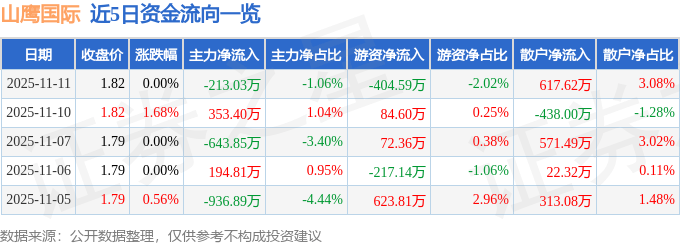 股票行情快报:山鹰国际(600567)11月11日主力资金净卖出213.03万元