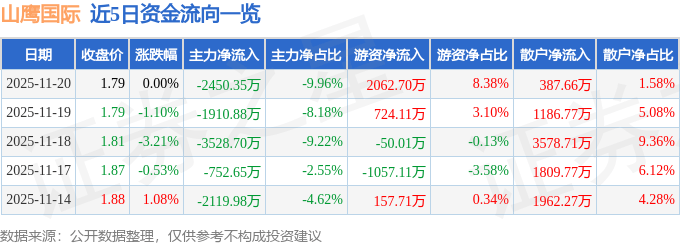 | | | | | 日期 收盘价 涨跌幅 主力净流入 主力净占比 游资净占比 散户净流入 散户净占比 | | | | | | --- | --- | --- | --- | --- | --- | --- | --- | --- | | 2025-11-20 | | 1.79 0.00% | -2450.35万 | -9.96% | 2062.70万 | 8.38% | 387.66万 | 1.58% | | 2025-11-19 | 1.79 | -1.10% | -1910.88万 | -8.18% | 724.11万 | 3.10% | 1186.77万 | 5.08% | | 2025-11-18 | 1.81 | -3.21% | -3528.70万 | -9.22% | -50.01万 | -0.13% | 3578.71万 | 9.36% | | 2025-11-17 | 1.87 | -0.53% | -752.65万 | -2.55% | -1057.11万 | -3.58% | 1809.77万 | 6.12% | | 2025-11-14 | 1.88 | 1.08% | -2119.9 ...
