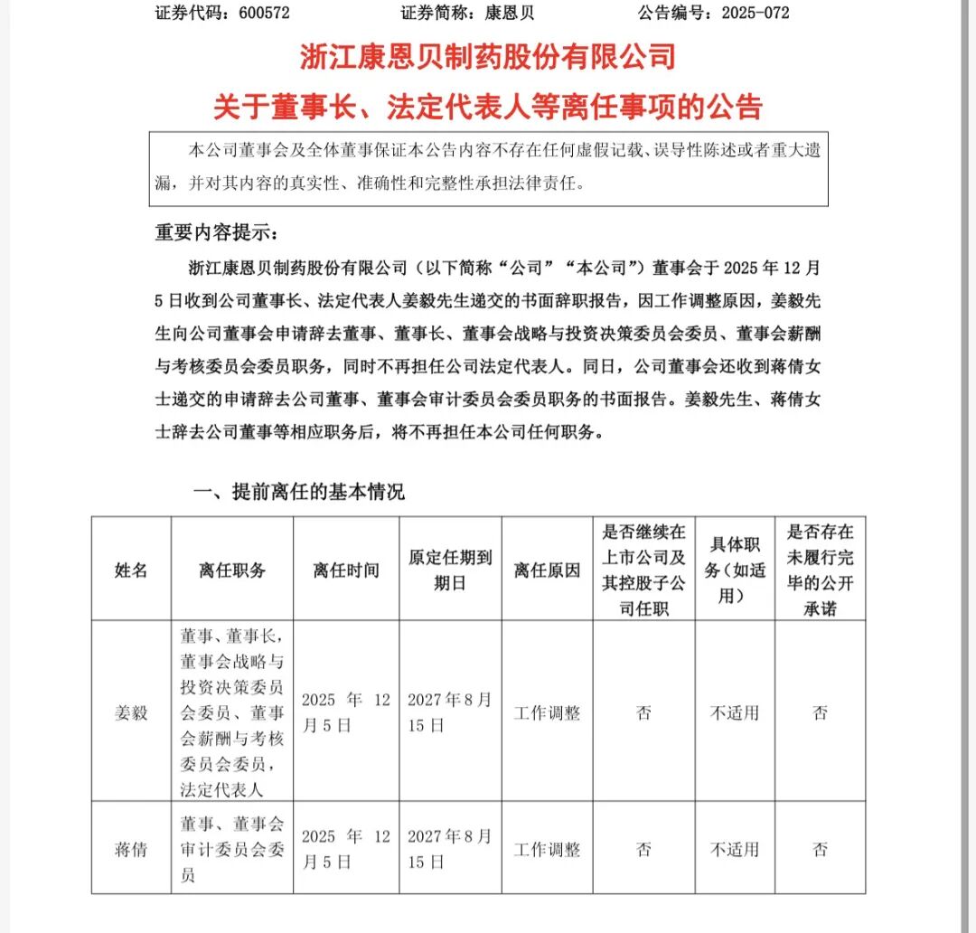 近日,康恩贝(600572)发布公告表示,浙江康恩贝制药股份有限公司董事会于2025年12月5日收到公 司董事长、法定代表人姜毅递交的书面辞职报告,因工作调整原因,姜毅向公司董事会申请辞去董事、 董事长、董事会战略与投资决策委员会委员、董事会薪酬与考核委员会委员职务,同时不再担任公司法 定代表人。 同日,公司董事会还收到蒋倩递交的申请辞去公司董事、董事会审计委员会委员职务的书面报告。姜 毅、蒋倩辞去公司董事等相应职务后,将不再担任公司任何职务。 公告显示,姜毅与蒋倩原定于2027年8月15日任职到期,两人不存在未履行完毕的公开承诺。 ...