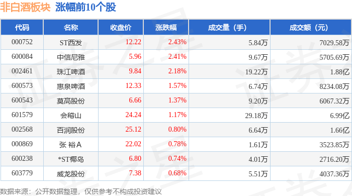 证券之星消息,11月13日非白酒板块较上一交易日上涨0.74%,ST西发领涨。当日上证指数报收于 4029.5,上涨0.73%。深证成指报收于13476.52,上涨1.78%。非白酒板块个股涨跌见下表: | 代码 | 名称 | 收盘价 | 涨跌幅 | 成交量(手) | 成交额(元) | | | --- | --- | --- | --- | --- | --- | --- | | 000752 | ST西发 | 12.22 | 2.43% | 5.84万 | 7029.58万 | | | 600084 | 中信尼雅 | 5.96 | 2.41% | 9.67万 | 5705.69万 | | | 002461 | 珠江啤酒 | 9.84 | 2.18% | 19.22万 | | 1.88亿 | | 600573 | 惠泉啤酒 | 12.33 | 1.57% | 6 6.74万 | 8234.08万 | | | 600543 | 草高股份 | 6.66 | 1.37% | 9.20万 | 6067.32万 | | | 601579 | 会稳山 | 24.24 | 1.17% | 29.18万 | | 6.99亿 ...