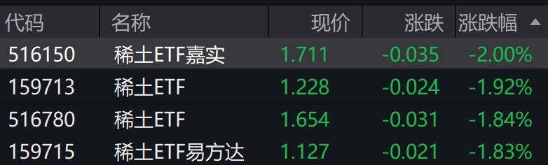 稀土概念股走低,中国稀土跌超3%,北方稀土、卧龙电驱、盛和资源、包钢股份跌超2%。 受盘面影响,稀土相关ETF跌约2%。 | 代码 | 名称 | 现价 | 涨跌 涨跌幅 ▲ | | --- | --- | --- | --- | | 516150 | 稀土ETF嘉实 | | 1.711 -0.035 -2.00% | | 159713 | 稀土ETF | 1.228 | -0.024 -1.92% | | 516780 | 稀土ETF | 1.654 | -0.031 -1.84% | | 159715 | | 稀土ETF易方达 | | 有券商表示,稀土作为高端制造与战略新兴产业的核心资源,正呈现供需两端共振格局。在供给集中度提升与 需求结构升级的背景下,稀土产业链的战略地位有望进一步巩固,为高端制造发展注入长期驱动力。 (文章来源:每日经济新闻) ...