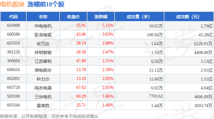 证券之星消息,12月1日电机板块较上一交易日上涨1.58%,中电电机领涨。当日上证指数报收于 3914.01,上涨0.65%。深证成指报收于13146.72,上涨1.25%。电机板块个股涨跌见下表: | 代码 | 名称 | 收盘价 | 涨跌幅 | 成交量(手) | 成交额(元) | | --- | --- | --- | --- | --- | --- | | 603988 | 中电电机 | 25.95 | 5.15% | 10.65万 | 2.79亿 | | 600580 | 卧龙电驱 | 43.06 | 3.63% | 100.94万 | 43.28亿 | | 603350 | 安乃达 | 38.19 | 2.88% | + 1.64万 | 6220.91万 | | 301226 | 祥明智能 | 28.58 | 2.47% | 1.59万 | 4498.00万 | | 300660 | 江苏音利 | 47.89 | 2.31% | 6.58万 | 3.13亿 | | 600416 | 湘电股份 | 13.79 | 2.30% | 21.13万 | 2.91亿 | | 002892 | 科力尔 | 13. ...