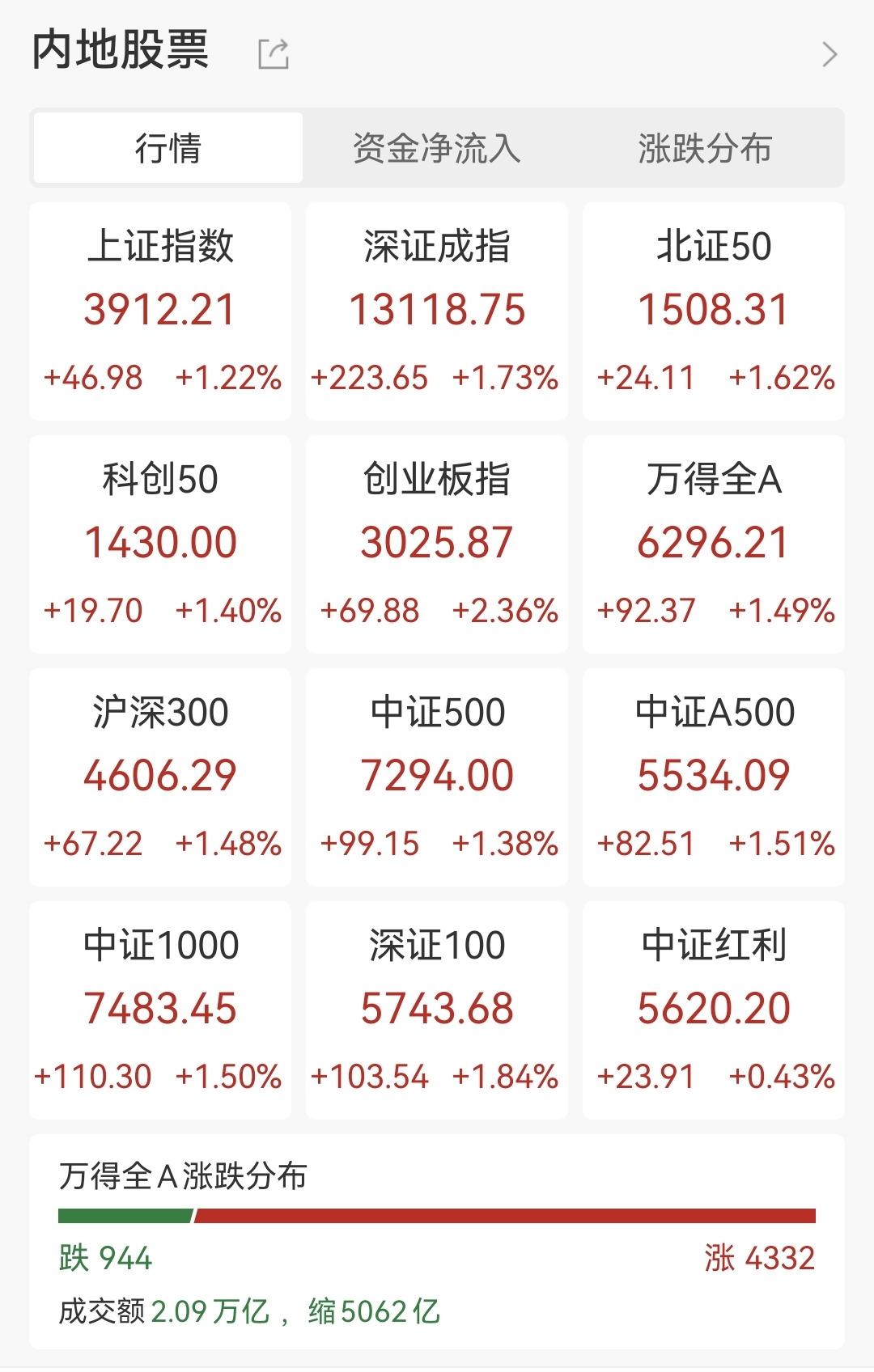 视频丨柳润瑛 | 内地股票 | | | | --- | --- | --- | | 行情 | 资金净流入 | 涨跌分布 | | 上证指数 | 深证成指 | 北证50 | | 3912.21 | 13118.75 | 1508.31 | | +46.98 +1.22% +223.65 +1.73% +24.11 +1.62% | | | | 科创50 | 创业板指 | 万得全A | | 1430.00 | 3025.87 | 6296.21 | | +19.70 +1.40% +69.88 +2.36% +92.37 +1.49% | | | | 沪深300 | 中证500 | 中证A500 | | 4606.29 | 7294.00 | 5534.09 | | +67.22 +1.48% +99.15 +1.38% +82.51 +1.51% | | | | 中证1000 | 深证100 | 中证红利 | | 7483.45 | 5743.68 | 5620.20 | | +110.30 +1.50% +103.54 +1.84% +23.91 +0.43% | | | 10月15日,A股探底回升,截至收盘, ...
