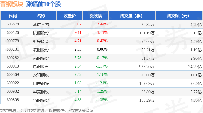 | 代码 | 名称 | 收盘价 | 涨跌幅 | 成交量(手) | 成交额(元) | | --- | --- | --- | --- | --- | --- | | 600581 | 八一钢铁 | 2.99 | -7.72% | 184.06万 | 5.50亿 | | 002110 | 三钢闽光 | 4.44 | -4.10% | 46.11万 | 2.07亿 | | 601005 | 重庆钢铁 | 1.53 | -2.55% | 276.07万 | 4.24亿 | | 600782 | 新钢股份 | 3.98 | -2.45% | 112.03万 | 4.49 Z | | 000709 | 河钢股份 | 2.51 | -2.33% | 147.97万 | 3.72亿 | | 000898 | 鞍钢股份 | 2.63 | -2.23% | 60.29万 | 1.59亿 | | 601003 | 柳钢股份 | 5.21 | -2.07% | 20.57万 | 1.07亿 | | 600019 | 宝钢股份 | 7.16 | -1.92% | 127.02万 | 9.19 (Z | | 000717 | 中南股份 ...