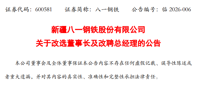 八一钢铁(600581)董事长、总经理双双辞职,"换帅"过后还将面临退市风险。 八一钢铁2月26日晚公告称,近日收到公司董事长柯善良、总经理刘文壮先生提交的书面辞职报告。柯善良、刘文壮先生因工作原因,辞去公司董事长、 总经理职务。公司于2026年2月26日召开第九届董事会第三次会议,审议通过了《关于改选第九届董事会董事长的议案》和《关于改聘总经理的议案》, 同意选举何宇城先生为公司第九届董事会董事长,同时担任公司法定代表人职务,同意聘任张志刚先生为公司总经理,上述任期自本次董事会审议通过之 日起至第九届董事会任期届满之日止。 根据公告,公司第九届董事会第三次会议还审议通过了《关于改选第九届董事会部分非独立董事的议案》,同意张志刚先生为公司董事候选人,任期从股 东会决议通过之日起计算,至第九届董事会任期届满时为止。 今年1月30日,八一钢铁公告称,公司、控股股东及相关当事人收到新疆证监局下发的《行政处罚决定书》。经查明,2022年至2024年期间,八一钢铁与 控股股东新疆八一钢铁集团有限公司(下称八钢集团)及其关联方发生非经营性资金往来的关联交易,未及时披露且未在相应年度报告中披露,导致定期报 告存在重大遗漏。 ...