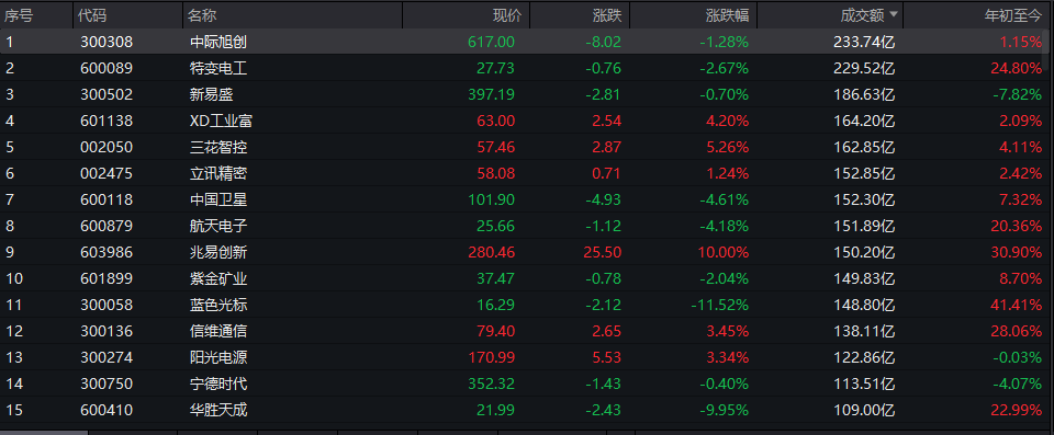 市场高开低走,三大指数集体收跌。截至收盘,沪指跌0.26%报4101.91点,深成指跌0.18%,创业板指跌0.2%。全市场超2900只个股下 跌。 从板块来看,半导体产业链集体走强,长电科技涨停创5年多新高,美埃科技、康强电子、圣晖集成涨停。 | 序号 | 代码 | 名称 | 现个 | 涨跌 | 涨跌幅 | 成交额 ▼ | 年初至今 | | --- | --- | --- | --- | --- | --- | --- | --- | | 1 | 300308 | 中际旭创 | 617.00 | -8.02 | -1.28% | 233.74Z | 1.15% | | 2 | 600089 | 特变电工 | 27.73 | -0.76 | -2.67% | 229.52亿 | 24.80% | | 3 | 300502 | 新易盛 | 397.19 | -2.81 | -0.70% | 186.63亿 | -7.82% | | 4 | 601138 | XD工业富 | 63.00 | 2.54 | 4.20% | 164.20亿 | 2.09% | | 5 | 002050 | 三花智控 | 57.46 | ...