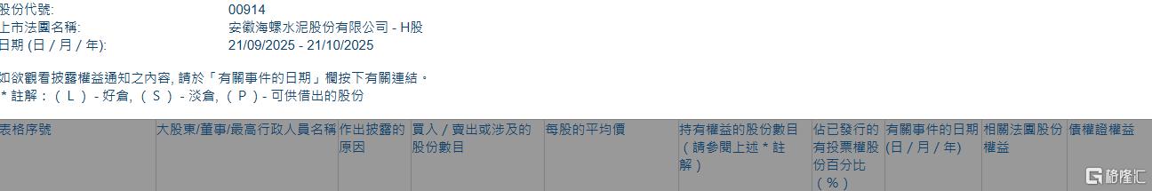 格隆汇10月21日丨根据联交所最新权益披露资料显示,2025年10月15日,海螺水泥(00914.HK)获JPMorgan Chase & Co.以每股均价25.5317港元增持好仓 330.37万股,涉资约8435万港元。 增持后,JPMorgan Chase & Co.最新持好仓数目为132,669,432股,持好仓比例由9.95%上升至10.20%。 | 股份代號: | 00914 | | --- | --- | | 上市法國名稱: | 安徽海螺水泥股份有限公司 - H股 | | 日期 (日 / 月 / 年): | 21/09/2025 - 21/10/2025 | | 麦格序號 | 大股東/董事/最高行政人員名稱作出披露的 買入 / 賣出或涉及的 每般的平均價 | | | 持有權益的股份數目 佔已發行的 有關事件的日期 | | | --- | --- | --- | --- | --- | --- | | | 股份數目 | | | 梳松后上臨發船 | 有投票權股 (日 / 月 / 年) | | | | | | | 防自分配 | | | | | | | 96 ) | | CS20251020E00317 ...