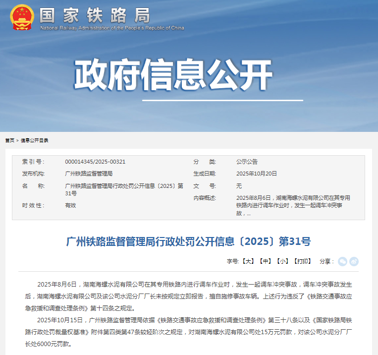 齐鲁晚报·齐鲁壹点记者于国家铁路局政府信息公开栏了解到,10月20日,其公示了广州铁路监督管理局行政 处罚公开信息〔2025〕第31号。据悉,被行政处罚单位为海螺水泥(600585.SH/00914.HK)旗下的湖南海螺 水泥有限公司(下称"湖南海螺水泥")。 | 索引号: | 000014345/2025-00321 | 分 营 | 公示公告 | | --- | --- | --- | --- | | 发布机构: | 广州铁路监督管理局 | 生成日期: | 2025年10月20日 | | ਮ 标 | 广州铁路监督管理局行政处罚公开信息〔2025〕第 | 文 号: | 元 | | | 31号 | | | | | | 内容概述: | 2025年8月6日,湖南海螺水泥有限公司在其专用 | | 时效性: | 有效 | | 铁路内进行调车作业时,发生一起调车冲突事 | | | | | 故 ... | 内容显示,2025年8月6日,湖南海螺水泥在其专用铁路内进行调车作业时,发生一起调车冲突事故,调车冲 突事故发生后,湖南海螺水泥及该公司水泥分厂厂长未按规定立即报告,擅自施修事故车辆。上述行为违反 了《铁路交通事故应急救 ...