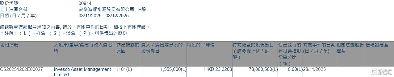 | 表格序號 | 大股東/董事/最高行政人員名 作出披露的 買入 / 費出或涉及的 每股的平均價 | | | 持有權益的股份數目 佔已發行的 有關事件的日期 相 | | | --- | --- | --- | --- | --- | --- | | | 原因 | 股份數目 | | (請參閱上述*註 | 有投票權股 (日 / 月 / 年) 材 | | | | | | | 份自分比 | | | | | | | 96 ) | | CS20251202E00027 | Invesco Asset Management 101(L) 1,555,000(L) | | HKD 23.3208 | 78,000,500(L) | 6.00(L)28/11/2025 | | | Limited | | | | | 格隆汇12月3日丨根据联交所最新权益披露资料显示,2025年11月28日,海螺水泥(00914.HK)获Invesco Asset Management Limited在场内以每股均价23.3208 港元增持155.5万股,涉资约3626.38万港元。 增持后,Invesco Asset Management Li ...