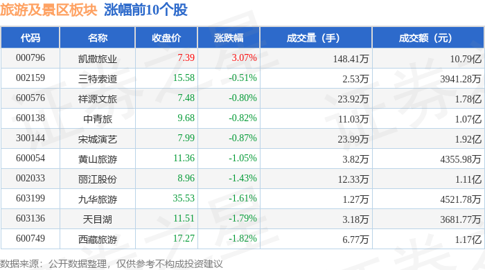 证券之星消息,11月20日旅游及景区板块较上一交易日下跌2.02%,大连圣亚领跌。当日上证指数报收 于3931.05,下跌0.4%。深证成指报收于12980.82,下跌0.76%。旅游及景区板块个股涨跌见下表: | 代码 | 名称 | 收盘价 | 涨跌幅 | 成交量(手) | 成交额(元) | | --- | --- | --- | --- | --- | --- | | 600593 | 大连圣亚 | 52.60 | -6.57% | 17.95万 | 10.06亿 | | 002059 | 云南旅游 | 5.84 | -6.41% | 124.99万 | 7.40亿 | | 000558 | 天府文旅 | 5.50 | -3.85% | 75.11万 | 4.17亿 | | 603099 | 长白山 | 52.00 | -3.22% | 16.60万 | 8.72亿 | | 600706 | 曲江文旅 | 10.70 | -2.99% | 13.10万 | 1.41亿 | | 000430 | *ST张股 | 8.16 | -2.74% | 18.04万 | 1.47亿 | | 002627 | 三峡旅游 ...