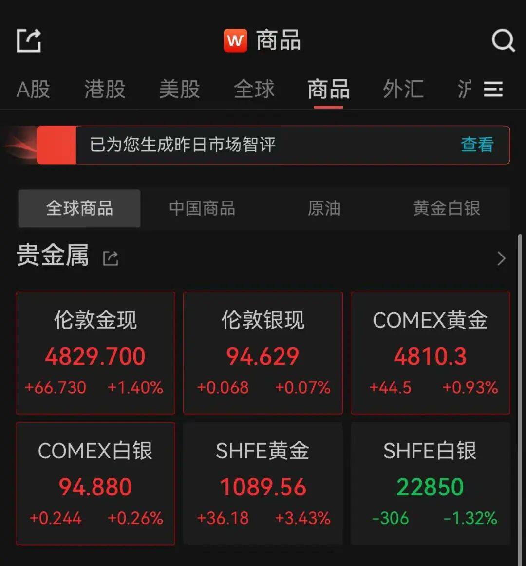 与此同时,国内金饰价格持续上涨,多品牌金饰克价站上1490元,再创近期新高。中新经纬查询发现,21日,周生生金饰报价1495元/克,单日上涨41 元;老凤祥报价1498元/克,单日上涨42元/克;老庙黄金报价1493元/克,单日上涨38元/克。 今日金价 老凤祥京冀会员中心 2026年1月21日 09:20 北京 21日上午,现货黄金(伦敦金现)强势拉涨,盘中站上4800美元,再刷新历史新高。截至发稿,报4829.700美元/盎司,涨1.40%。COMEX黄金期货涨近 1%,报4810.3美元/盎司。 | 14 | | w 商品 | | | | Q | | --- | --- | --- | --- | --- | --- | --- | | A股 港股 | 美股 | 全球 | 商品 | 外汇 | 沂三 | | | 已为您生成昨日市场智评 | | | | | 查看 | | | 全球商品 | 中国商品 | | 原油 | 黄金白银 | | | | 贵金属 | | | | | | | | 伦敦金现 | | 伦敦银现 | | COMEX黄金 | | | | 4829.700 | | 94.629 | | 4810.3 ...