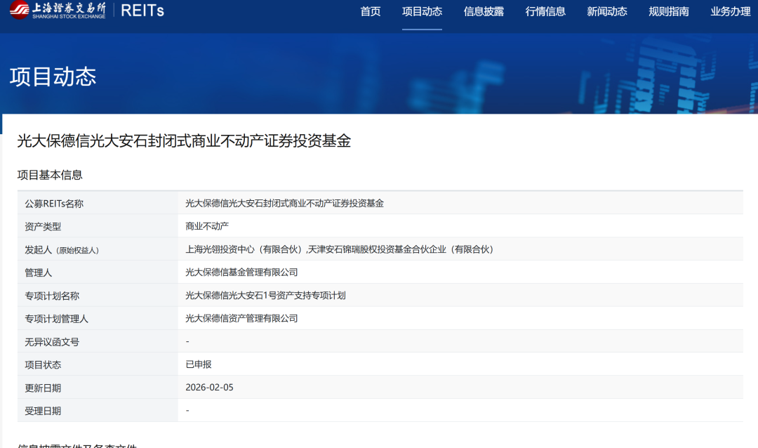 | 公募REITs名称 | 光大保德信光大安石封闭式商业不动产证券投资基金 | | --- | --- | | 资产类型 | 商业不动产 | | 发起人(原始权益人) | 上海光翎投资中心(有限合伙),天津安石锦瑞股权投资基金合伙企业(有限合伙) | | 管理人 | 光大保德信基金管理有限公司 | | 专项计划名称 | 光大保德信光大安石1号资产支持专项计划 | | 专项计划管理人 | 光大保德信资产管理有限公司 | | 无异议函文号 | | | 项目状态 | 已申报 | | 更新日期 | 2026-02-05 | | 受理日期 | | 近日,据上交所官网显示,光大保德信光大安石封闭式商业不动产证券投资基金正式申报。此前,2026 年 1 月 30 日,光大嘉宝股份有限公司公告,公司 召开第十一届董事会第三十四次(临时)会议,审议通过在管基金开展商业不动产公募 REITs 申报发行工作议案。 公司参与投资的在管基金上海光翎投资中心(有限合伙)和天津安石锦瑞股权投资基金合伙企业(有限合伙),拟分别以持有的静安大融城项目(位于上 海市静安区,总建筑面积约 18.9 万平方米,业态为商业零售)和江门大融城项目(位于 ...