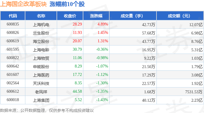 Market Overview - On November 21, the Shanghai State-Owned Enterprise Reform sector fell by 2.97% compared to the previous trading day, with Tibet City Investment leading the decline [1] - The Shanghai Composite Index closed at 3834.89, down 2.45%, while the Shenzhen Component Index closed at 12538.07, down 3.41% [1] Stock Performance - Shanghai Mechanical and Electrical (600835) saw a closing price of 28.29, with an increase of 4.89% and a trading volume of 427,300 shares, amounting to a transaction value of 1.207 billion [1] - Tibet City Investment (600773) experienced a significant drop of 10.02%, closing at 12.93, with a trading volume of 473,100 shares [2] - Hydrogen Alkali Chemical (600618) and Data Port (603881) also faced declines of 9.53% and 7.83%, respectively [2] Capital Flow - The Shanghai State-Owned Enterprise Reform sector saw a net outflow of 2.59 billion yuan from institutional investors, while retail investors had a net inflow of 2.12 billion yuan [2] - The main capital flow data indicates that Shanghai Mechanical and Electrical had a net inflow of 1.20 billion yuan from institutional investors, while retail investors had a net outflow of 43.99 million yuan [3]