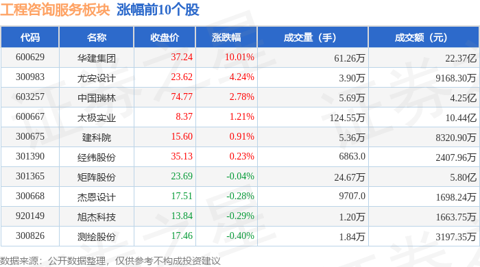 从资金流向上来看,当日工程咨询服务板块主力资金净流出3406.5万元,游资资金净流入7617.88万元, 散户资金净流出4211.38万元。工程咨询服务板块个股资金流向见下表: 证券之星消息,10月16日工程咨询服务板块较上一交易日上涨0.4%,华建集团领涨。当日上证指数报收 于3916.23,上涨0.1%。深证成指报收于13086.41,下跌0.25%。工程咨询服务板块个股涨跌见下表: | 代码 | 名称 | 收盘价 | 涨跌幅 | 成交量(手) | 成交额(元) | | --- | --- | --- | --- | --- | --- | | 600629 | 华建集团 | 37.24 | 10.01% | 61.26万 | 22.37 Z | | 300983 | 尤安设计 | 23.62 | 4.24% | 3.90万 | 9168.30万 | | 603257 | 中国瑞林 | 74.77 | 2.78% | 5.69万 | 4.25亿 | | 600667 | 太极实业 | 8.37 | 1.21% | 124.55万 | 10.44亿 | | 300675 | 建科院 | 15.60 | 0. ...