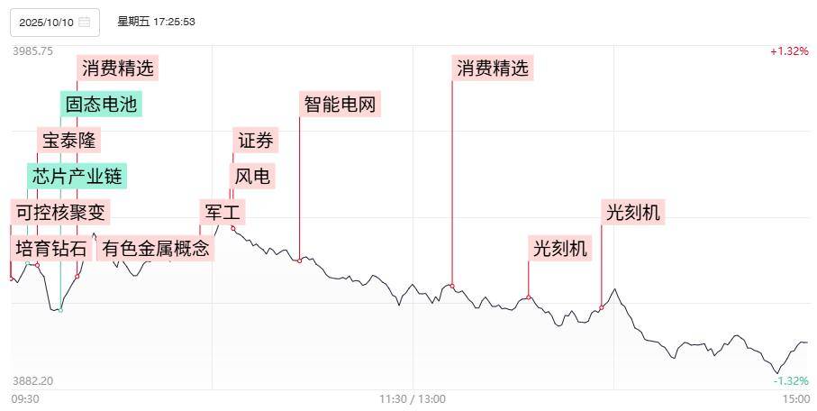 中国资产集体回调。 继节后首个交易日大涨后,A股今日(10月10日)大幅回落,沪指午后跌约1%失守3900点,创业板指 一度跌超5%,尾盘跌幅略有收窄;港股亦下挫,恒生指数跌近2%,恒生科技指数跌逾3%。此外,富时 中国A50指数期货跌约2%。 具体来看,沪指盘中震荡下探,午后加速下行,一度跌超1%失守3900点;创业板指、科创50指数大幅 回调。截至收盘,沪指跌0.94%报3897.03点,深证成指跌2.7%报13355.42点,创业板指跌4.55%报 3113.26点,科创50指数跌5.61%,沪深北三市合计成交25345亿元,较此前一日减少1378亿元。 近期强势的半导体板块大幅跳水,翱捷科技、东芯股份、华虹公司等跌超10%,中芯国际跌近8%;有 色板块亦回落,西部黄金(601069)、寒锐钴业(300618)跌超9%;燃气、煤炭、钢铁、石油等板块 逆市上扬,大众公用(600635)近4个交易日斩获3板,洪通燃气(605169)、大有能源(600403)、广 东明珠(600382)等均涨停;食品饮料股拉升,庄园牧场(002910)连续两日涨停;保险、银行、券商 板块均有所表现。此外,今日登陆北交所的奥美 ...
