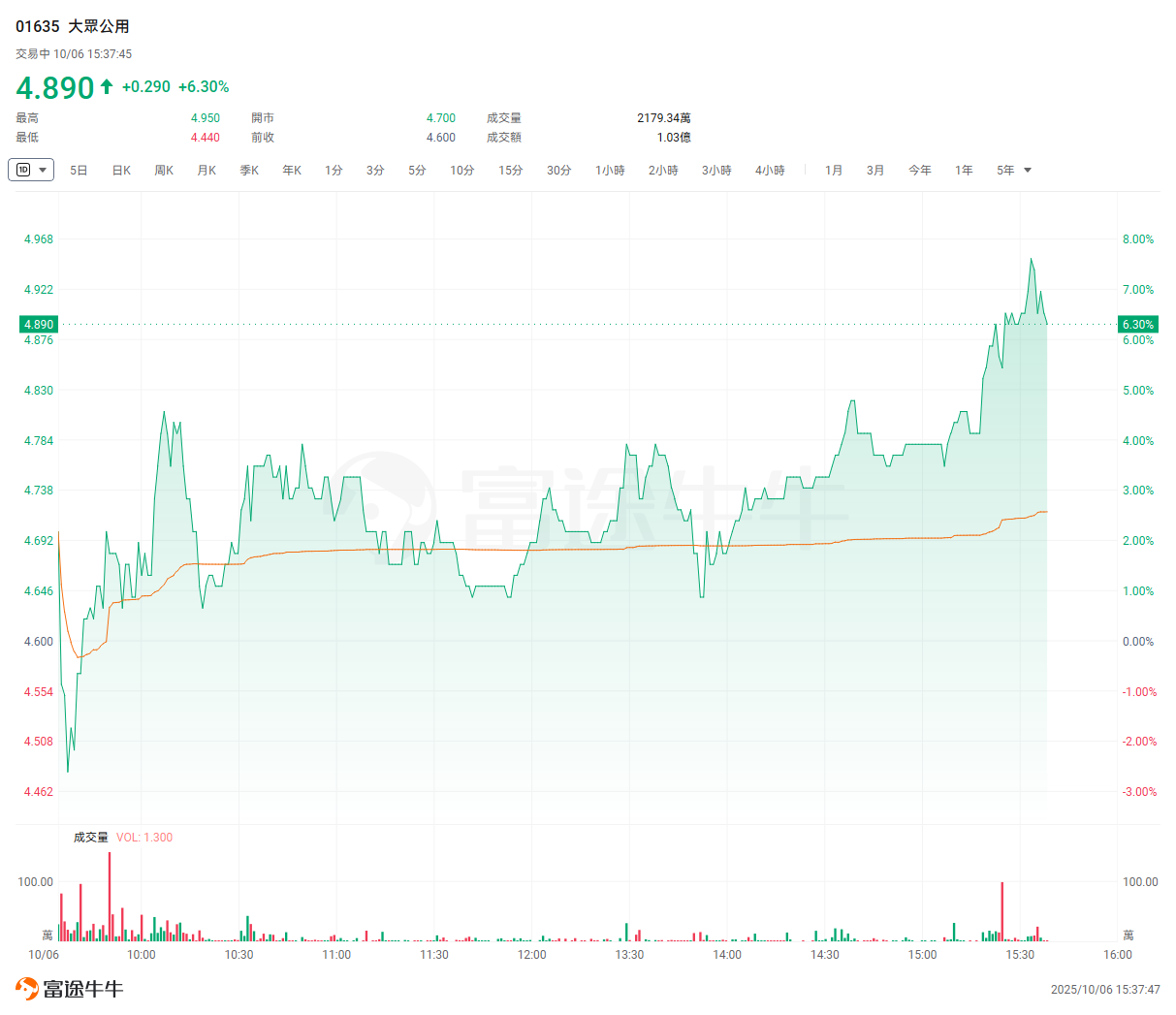 逆市大涨! 今日(10月3日)在港股市场整体下跌的背景下,大众公用(01635.HK)的股价逆市大涨。该股盘中涨 幅一度超过30%,最高触及4.92港元/股,创出历史新高。 公开资料显示,大众公用是一家公用事业和金融创投双轮驱动的投资控股型企业。大众公用近期曾表示, 公司参股深创投,深创投及其基金持有宇树科技股份。值得关注的是,深创投还参股了知名GPU企业摩尔 线程,后者科创板IPO申请已通过上交所上市委会议审议。 同日,在港股市场上,核能概念股也集体大涨,中核国际一度涨超20%,上海电气一度涨超16%。那 么,核能股又为何爆发呢? 大众公用港股大涨 10月3日早盘,港股市场整体调整。截至港股午间收盘,香港恒生指数下跌0.87%,恒生科技指数跌 1.44%。汽车股集体下挫,比亚迪股份跌超4%,小鹏汽车跌近4%,理想汽车跌超3%。此外,快手跌超 3%,比亚迪电子跌超2%,京东集团跌超2%。 牛市来了还没上车?上天天基金APP搜索777注册即可领500元券包,优选基金10元起投!限 量发放!先到先得! 不过,大众公用港股却大幅飙升,盘中涨幅一度达到31.55%,最高触及4.92港元/股,创出历史新高。 截至港股午 ...