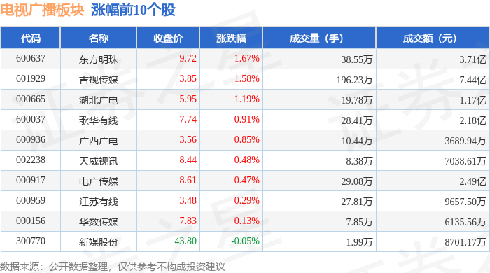 | 代码 | 名称 | 收盘价 | 涨跌幅 | 成交量(手) | 成交额(元) | | --- | --- | --- | --- | --- | --- | | 301551 | 元线传媒 | 37.44 | -1.24% | 6.64万 | 2.49 Z | | 300770 | 新媒股份 | 43.80 | -0.32% | 3.32万 | 1.47亿 | | 600936 | 广西广电 | 3.54 | 0.00% | 10.37万 | 3685.72万 | | 600959 | 江苏有线 | 3.54 | 0.00% | 45.86万 | 1.63亿 | | 601929 | 吉视传媒 | 3.94 | 0.00% | 362.90万 | 14.30 Z | | 002238 | 天威视讯 | 8.35 | 0.36% | 6.36万 | 5342.08万 | | 600037 | 歌华有线 | 7.54 | 0.80% | 14.12万 | 1.07亿 | | 920021 | 流金科技 | 6.67 | 0.91% | 7.91万 | 5333.28万 | | 000665 | 湖北广电 | 6 ...
