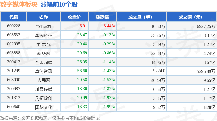 证券之星消息,11月26日数字媒体板块较上一交易日下跌1.68%,值得买领跌。当日上证指数报收于 3864.18,下跌0.15%。深证成指报收于12907.83,上涨1.02%。数字媒体板块个股涨跌见下表: | 代码 | 名称 | 收盘价 | 涨跌幅 | 成交量(手) | 成交额(元) | | | --- | --- | --- | --- | --- | --- | --- | | 600228 | *ST返利 | 6.91 | 3.44% | 10.30万 | | 6927.25万 | | 603533 | 掌阅科技 | 23.47 | -0.13% | 35.26万 | | 8.31亿 | | 002095 | 生意宝 | 20.48 | -0.29% | 5.89万 | | 1.21亿 | | 603888 | 新华网 | 20.69 | -0.86% | 1 22.88万 | | 4.74亿 | | 300413 | 芒果超媒 | 26.05 | -1.14% | 14.06万 | | 3.67亿 | | 66ZI0E | 草创资讯 | 56.60 | -1.43% | 9224.0 | | 529 ...