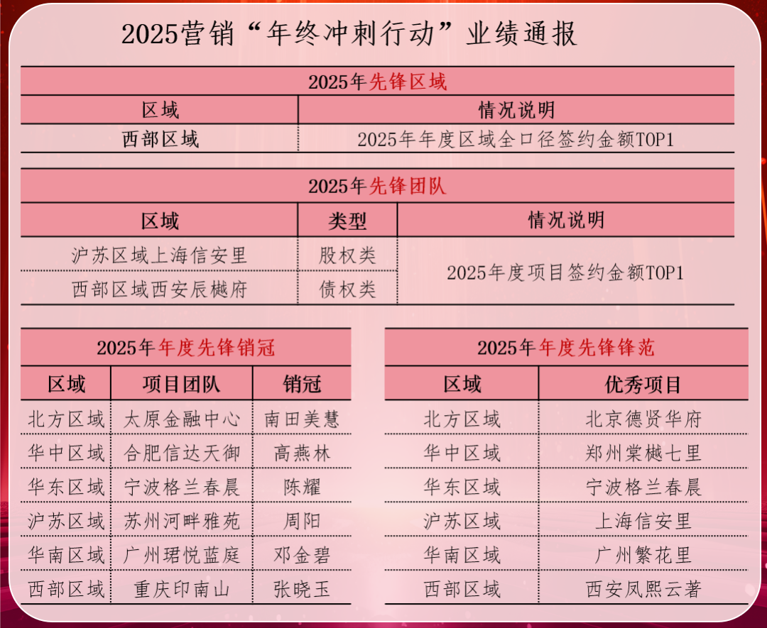 1月22日,公司召开2025年营销总结暨2026年新春开门红专项会。公司副总经理刘瑜主持会议并讲话,各区域公司营销条线分管领导,区域公司营销中心 负责人、重点项目销售负责人、信诚智慧相关负责人参加会议。 会议要求,一是打赢新春开门红硬仗。按返乡客群特点进行项目分类施策,结合场景做特色获客,配套激励与团队关怀,凝聚冲刺氛围;二是深化营销标 准化建设。统一投前研判、首开管控等全周期标准,转化优秀项目经验为管理资产,沉淀组织能力,筑牢新业务基础;三是落实降本增效要求。树立"过 紧日子"思想,明确费用压降目标,压缩低效投入、控中介成本,以收定支防超支,通过考核与数字化系统落地目标。 (来源:信达地产) 1月22日,公司召开2025年营销总结暨2026年新春开门红专项会。公司副总经理刘瑜主持会议并讲话,各区域公司营销条线分管领导,区域公司营销中心 负责人、重点项目销售负责人、信诚智慧相关负责人参加会议。 (来源:信达地产) 会议全面总结了2025年营销工作成效。2025年,房地产市场格局持续优化、竞争更趋理性,营销工作面临新的机遇与挑战。各区域公司及一线营销团队始 终坚守"敢打敢拼、目标导向"的核心价值观,凝心聚力、务 ...